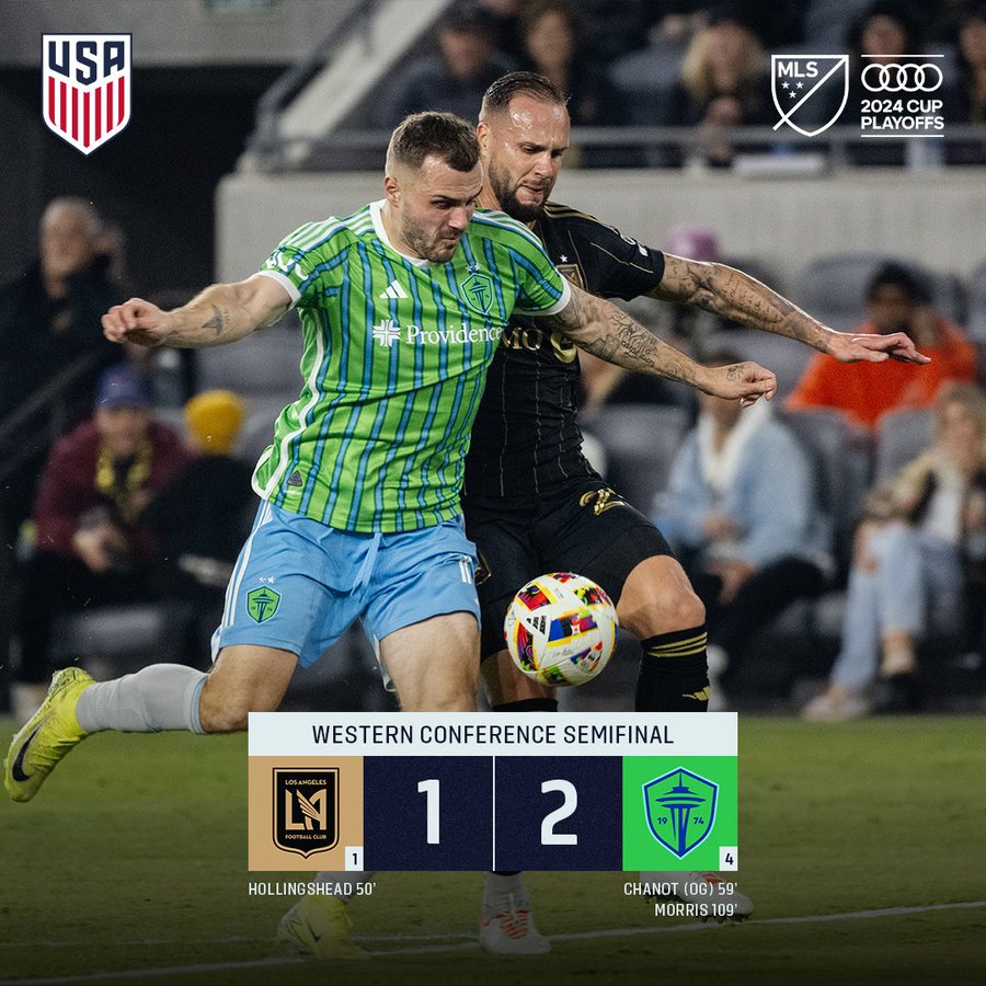 LAFC y Seattle se enfrentaron en un partido por la oeste – Semifinal 1 del torneo Estados Unidos – MLS 2024 y el partido acabรณ con un resultado final de 1-2. El gol del partido para el local lo anotรณ Ryan Hollingshead (5′ 2T). Mientras que los goles de visitante los hizo Jordan Morris (4′ A2) y Maxime Chanot (14′ 2T, en contra).