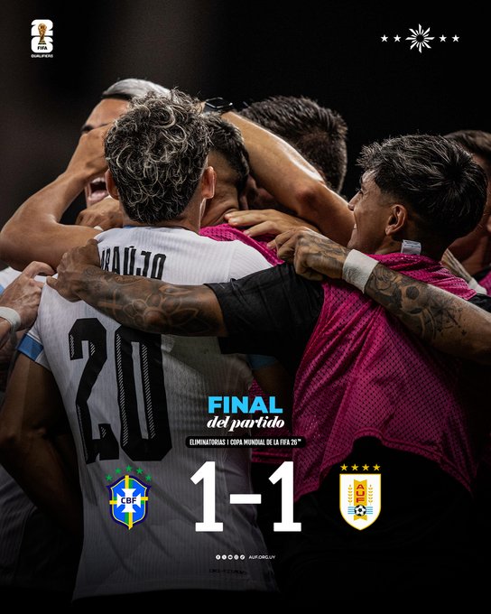 Un latigazo de Gerson dejรณ sin efecto un golazo de Federico Valverde anotado siete minutos antes y sellรณ en Salvador un empate 1-1 que consolidรณ este martes a Uruguay en el segundo puesto de las Eliminatorias Sudamericanas para la Copa Mundial FIFA 2026 y relegรณ a Brasil en el quinto.